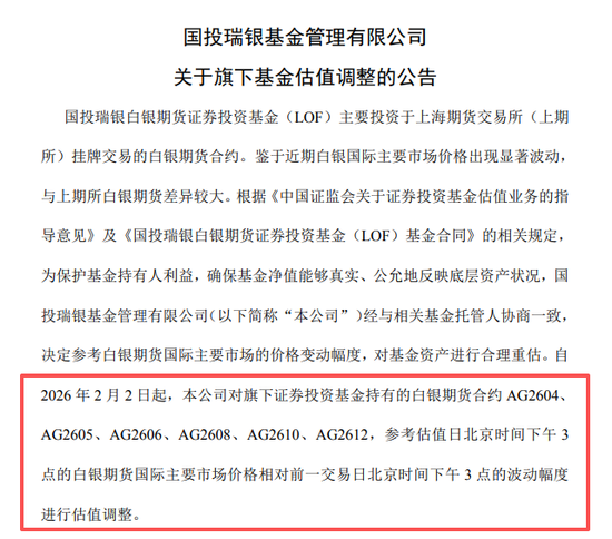 公告表示,自2026年2月2日起,本公司对旗下证券投资基金持有的白银期货合约AG2604、AG2605、AG2606、AG2608、AG2610、AG2612,参考估值日北京时间下午3点的白银期货国际主要市场价格相对前一交易日北京时间下午3点的波动幅度进行估值调整。
