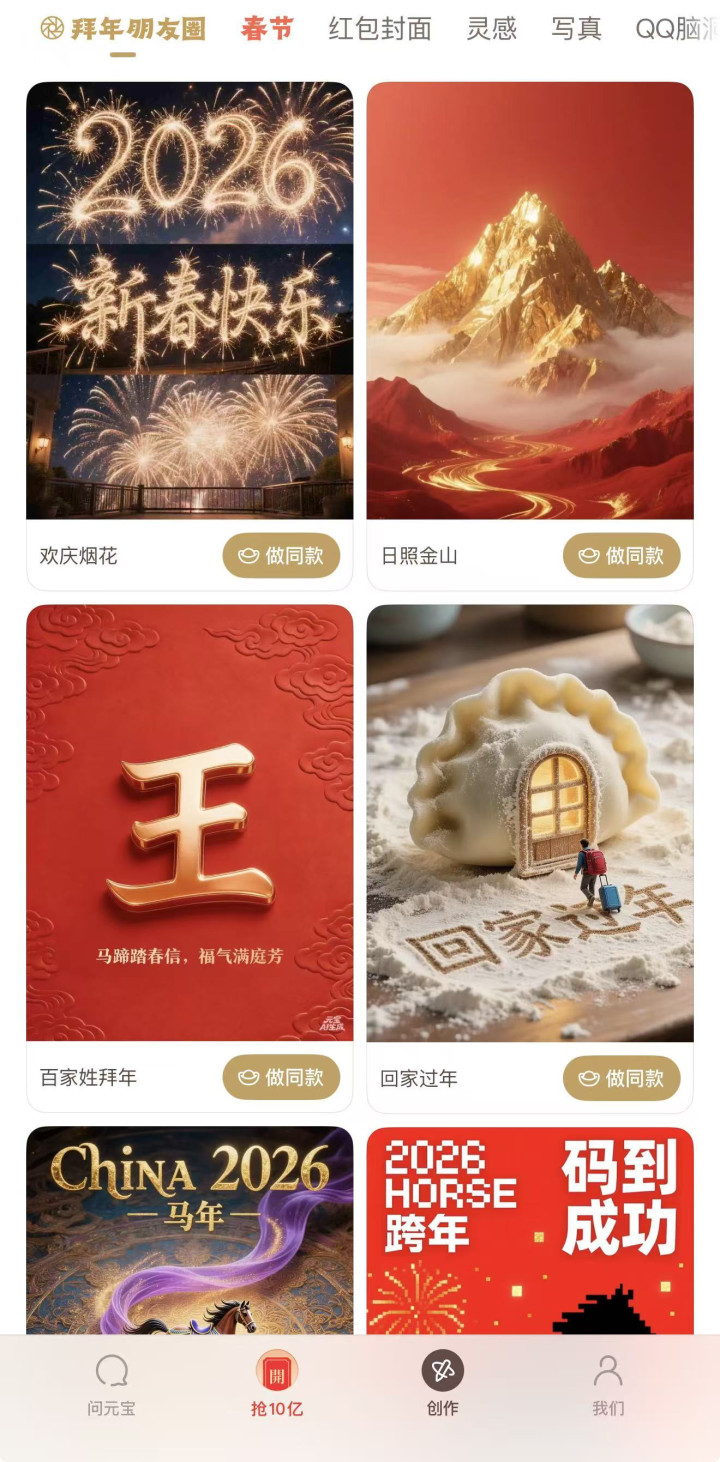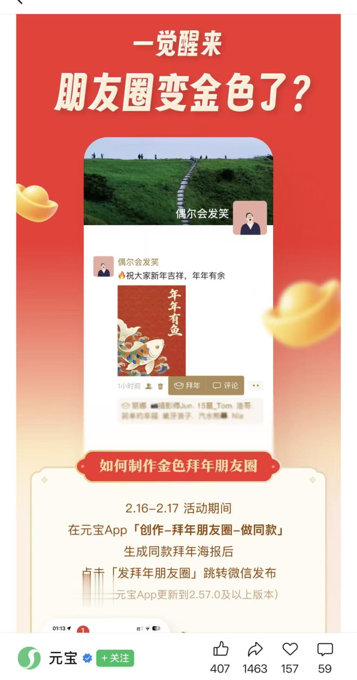 2026年除夕,微信可以发金色朋友圈了!元宝也宣布除夕追加100张万元现金“小马卡”。